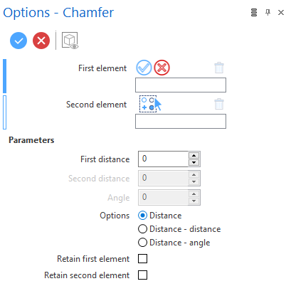 Selecting this option once the Options dialog box is displayed changes the chamfer definition mode. The First distance and Second distance value fields are both activated in the dialog box and are also available in the Graphic Area.